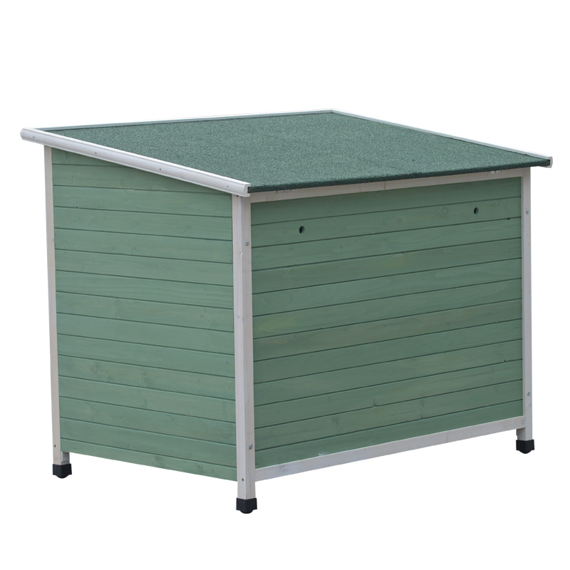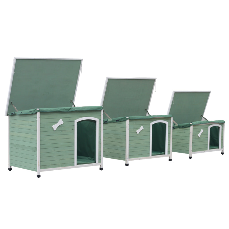 Give your small to medium-sized dog a cozy and durable haven with our Green Wooden Dog House. Crafted with waterproof wooden panels and a stable frame, it’s designed for both indoor and outdoor use—perfect for placing on your balcony, patio, or living room. The open roof allows for easy cleaning of pet hair and dirt, and lets you interact with or feed your pet anytime without hassle.Featuring an elevated non-slip base, it keeps the dog house off the ground to avoid moisture, dirt, and cold floors, ensuring your pet stays dry and comfortable even in humid conditions. The spacious interior offers ample room for your dog to stretch out and relax, while the breathable side door promotes good air circulation, preventing stuffiness.With a moisture-proof surface treatment, this dog house is built to last, resisting splashes and outdoor dew. Its classic wooden design adds a stylish touch to any space, combining functionality with aesthetics for a pet shelter your dog will love.